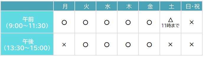 午前は9:00~11:30(土曜日は11:00まで)、午後は13:30~15:00に実施しています。