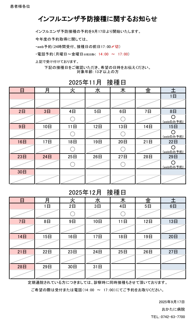 インフルエンザ予防接種の予約を2025年9月17日より開始いたします。 (予約可能日:11/4~12/4の間の火曜日・木曜日・土曜日)