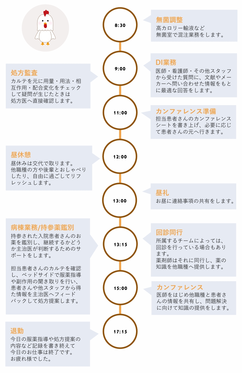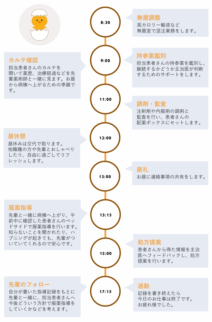最初は薬の知識も病態の知識も不安定で、私なんかが病院薬剤師になれるんだろうか?と不安でいっぱいでしたが、ずっと先輩が見ていてくれて患者さんや医師の前であたふたしてもフォローしてもらえるので安心でした。