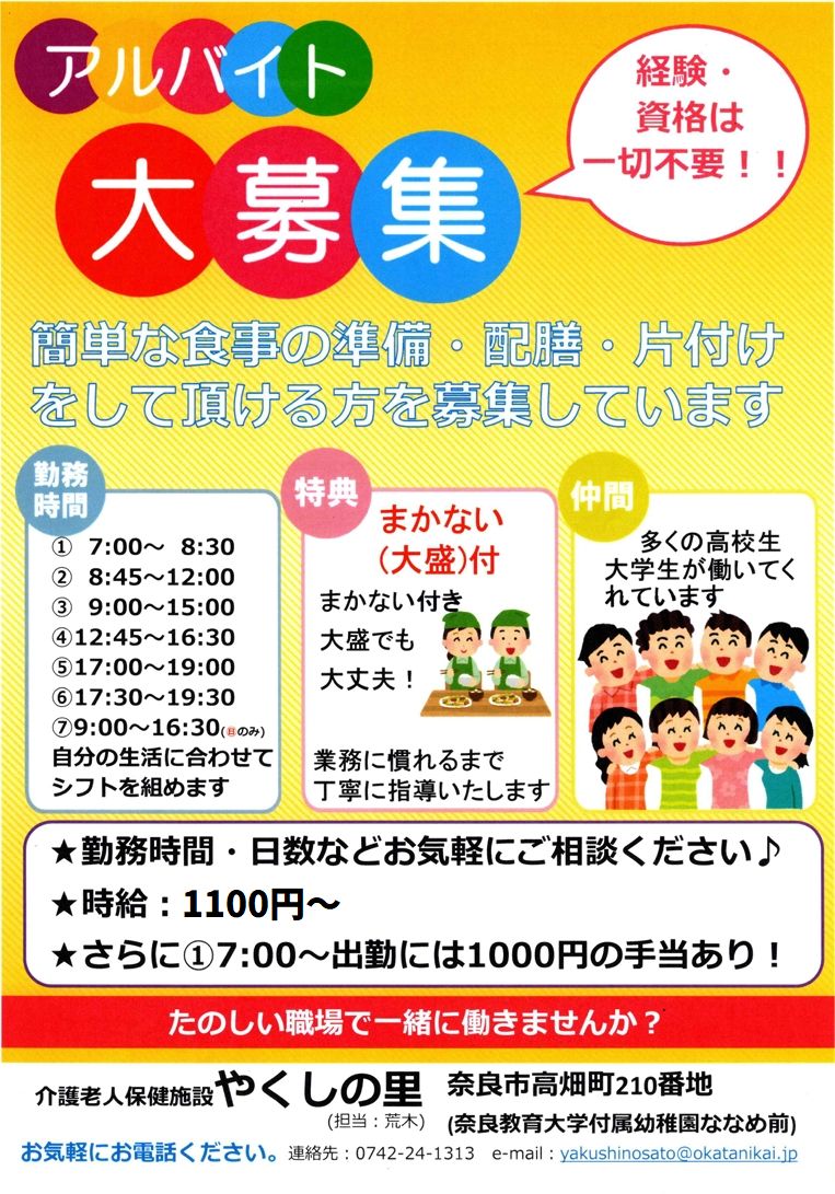 やくしの里では、簡単な食事の準備、配膳、片付けをしてもらえるアルバイトの方を募集しています。経験・資格は一切不要!!多様な勤務時間で、自分の生活に合わせてシフトが組めます。(まかない付)連絡先0742-24-1313(やくしの里 担当者荒木まで)